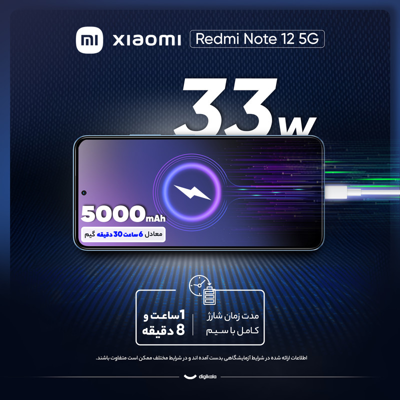 گوشیRedmi Note 12 5G از سری میانردههای محبوب شیائومی است که با طراحی جذاب، سختافزار قدرتمند و قابلیتهای مدرن، تجربهای فراتر از انتظار را به کاربران ارائه میدهد. حسگر اثر انگشت در لبه کناری گوشی طراحی شده تا دسترسی سریع و امنی داشته باشید. این گوشی با پشتیبانی از فناوری 5G، تراشهSnapdragon 4 Gen و پردازنده گرافیکیAdreno 619 همراه با ۸ گیگابایت رم، عملکرد سریع و روان در اجرای برنامهها و بازیها را تضمین میکند. طراحی باریک و وزن 188 گرمی این گوشی، آن را برای استفاده روزمره بسیار خوشدست کرده است. صفحه نمایش 6.67 اینچیAMOLED با نرخ تازهسازی 120 هرتز و روشنایی 1200 نیت، تجربهای بینظیر در تماشای فیلم، بازی و استفاده از اپلیکیشنها به شما ارائه میدهد. محافظ Corning Gorilla Glass 3 از صفحه نمایش در برابر خط و خش محافظت میکند. دوربین اصلی ۴۸ مگاپیکسل و با لنز عریض ساخته شدهاست. دوربین دوم ۸ مگاپیکسل و فوق عریض طراحی شدهاست. دوربین سوم هم با ۲ مگاپیسل لنز ماکرو در این گوشی شیائومی تعبیه شدهاست. دوربین سلفی 13 مگاپیکسلی این گوشی هم برای تماسهای ویدیویی و عکسهای پرتره عملکرد خوبی ارائه میدهد. گوشی شیائومیRedmi Note 12 5G ترکیبی از طراحی زیبا، عملکرد قوی، دوربینهای کاربردی و باتری پرقدرت است. این دستگاه برای کاربرانی که به دنبال یک گوشی میانرده با قابلیتهای مدرن هستند، انتخابی ایدهآل خواهد بود.