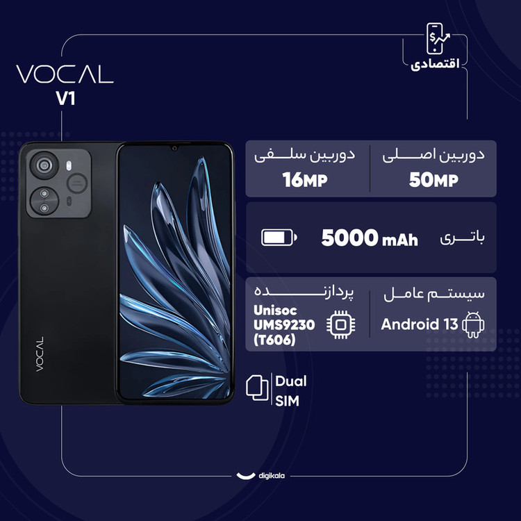 گوشی وکال یک برند گوشی تازه وارد است که به سفارش شرکت ایرانی آرکا تجارت و در کشور چین تولید شده است. دو مدل از این برند تاکنون معروفی شده که گوشی وکال مدل V1 نمونه پیشرفتهتر اما همچنان با قیمت فوقالعاده اقتصادی است. این گوشی ظاهر بسیار زیبا و در عین حال سادهای دارد که از آن لذت خواهید برد. نمایشگر آن از نوع LCD است و رزولوشن 720 × 1600 دارد که برای گوشی در این رنج قیمتی متناسب به نظر میرسد. دوربین این گوشی از یک ماژول سهگانه تشکیل شده است. دوربین اصلی رزولوشن 50 مگاپیکسلی دارد و با آن میتوانید عکسهای ساده و تصاویر ضروری را ثبت کنید. به جز اینها باید به پردازنده خوب این گوشی اشاره کنیم که عملکرد خوبی را برای کارهای روزانه و معمول از خود نشان داده است. همچنین با باتری 5000 میلیآمپرساعتی به راحتی میتوانید مدت زیادی بدون نیاز به شارژ مجدد کار کنید. این گوشی برای کسانی که استفاده سنگین ندارند و به دنبال یک مدل اقتصادی میگردند یک گزینه بسیار خوب خواهد بود.