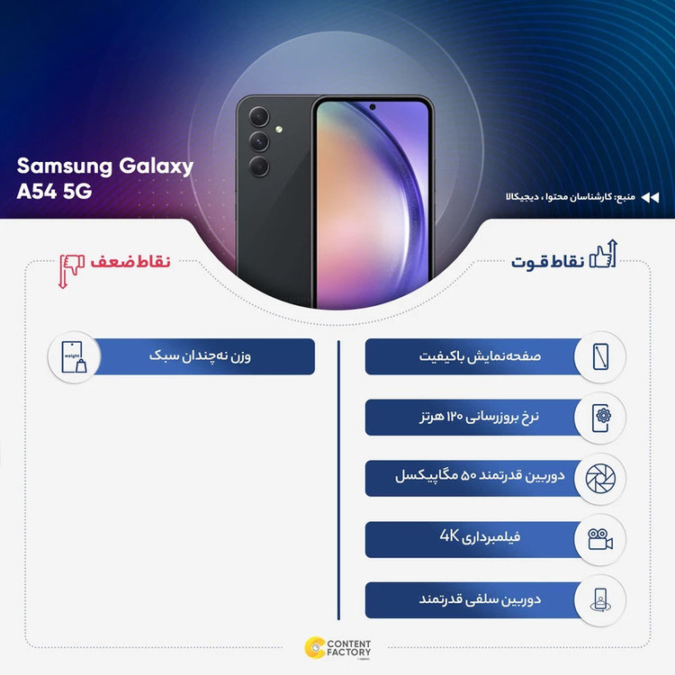 با هر سلیقه و توقعی از گوشیهای هوشمند میانرده، باید بدانید که گوشیهای میانرده سری A شرکت سامسونگ، میتوانند نیاز شما را برآورده کنند. سامسونگ Galaxy A54 5G هم با توجه به مشخصات فنی در نظر گرفته شده و البته قیمتی مقرون بهصرفه، ارزش خرید بالایی دارد. صفحهنمایش باکیفیت 6.4 اینچی این گوشی با رزولوشن بسیار خوب و حداکثر روشنایی 1000 نیت، در شرایط نوری متنوع و حتی زیر تابش مشتقیم نور خورشید هم، وضوح تصویر بسیار خوبی را ارائه میکند. حضور سنسور قدرتمند عریض (اصلی) برای ثبت تصاویر بسیار جذاب در نور روز و نور شب، سنسور دوربین فوق عریض 12 مگاپیکسل با زاویه دید گسترده 123 درجه که مناسب عکاسی در طبیعت است و همچنین سنسور 5 مگاپیکسل ماکرو برای ثبت تصاویر از فاصله نزدیک، بهخوبی تمام نیازهای شما را در عکاسی و حتی فیلمبرداری، فراتر از یک گوشی میانرده برآورده میکنند. پردازنده اگزینوس 1380 این گوشی هم سوالی عملکرد بسیار خوب در اجرای بازیهای حتی سنگین، سبب شده تا این گوشی توانایی پشتیبانی از شبکههای اینترنتی پرسرعت 5G را هم داشته باشد. در نهایت باتری 5000 میلیآمپرساعت هم به ازای هر بار شارژ صد درصدی، در شرایط استفاده معمولی، طول عمر مفید (زمان آماده بهکار) دو روز را ارائه میکند. همانطور که میدانید، درون جعبه این گوشی خبری از آداپتور شارژر نیست، اما این گوشی بههمراه شارژر 25 وات سامسونگ به فروش میرسد.