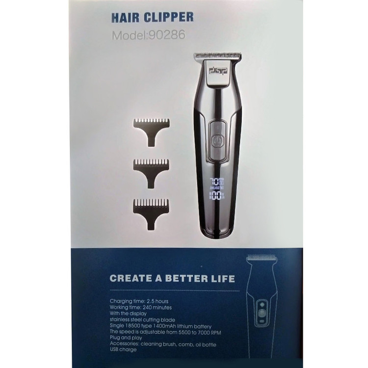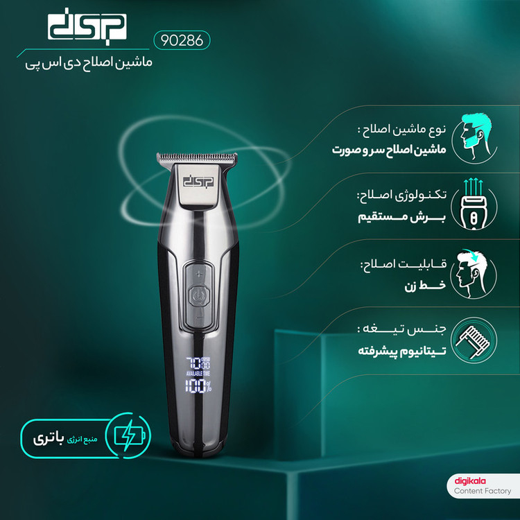 ماشین اصلاح موی سر و صورت دی اس پی مدل 90286، اصلاح به صورت تریمر، قابلیت تنظیم سرعت، منبع انرژی با برق، تکنولوژی اصلاح به صورت برش مستقیم، بههمراه برس تمیزکننده