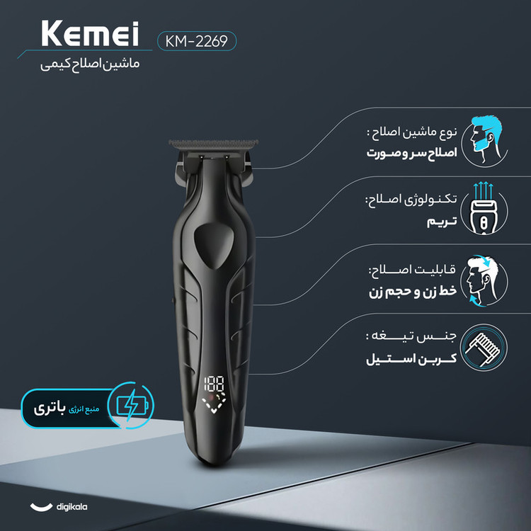 ماشین اصلاح موی سر و صورت کیمی مدل KM-2269، اصلاح به صورت تریمر، قابلیت اصلاح با شماره صفر، نمایشگر میزان شارژ، منبع انرژی باتری قابل شارژ، تکنولوژی اصلاح به صورت برش مستقیم، مدت زمان شارژ 180 دقیقه و مدت زمان استفاده پس از شارژ 300 دقیقه